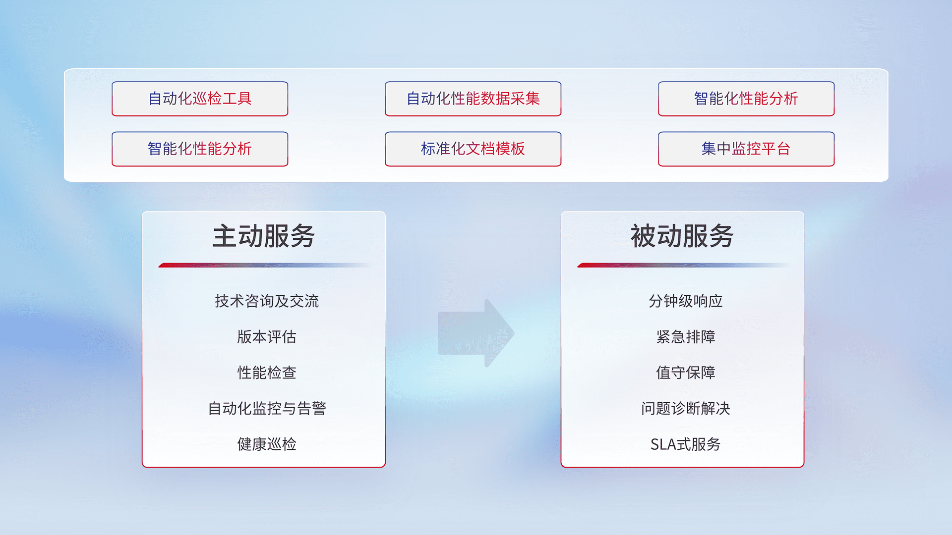 智能化工具和标准化文档,,保障服务质量,,提供主动服务(包含技术咨询、、、、版本评估、、、性能检查、、自动化监控与告警、、健康巡检)和被动服务包含(分钟级响应、、、、紧急排障、、、、值守保障、、、、问题诊断解决、、、SLA服务)。。